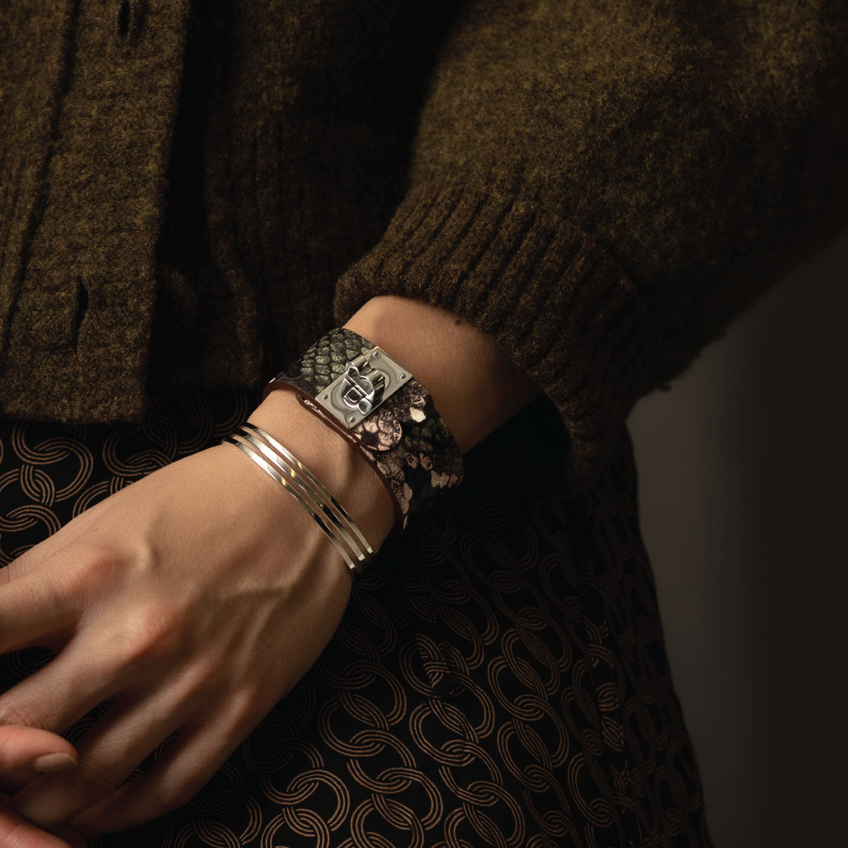 Material: Farrier is a two layer Italian calfskin bracelet, with a metal clasp in silver plated stainless steel.