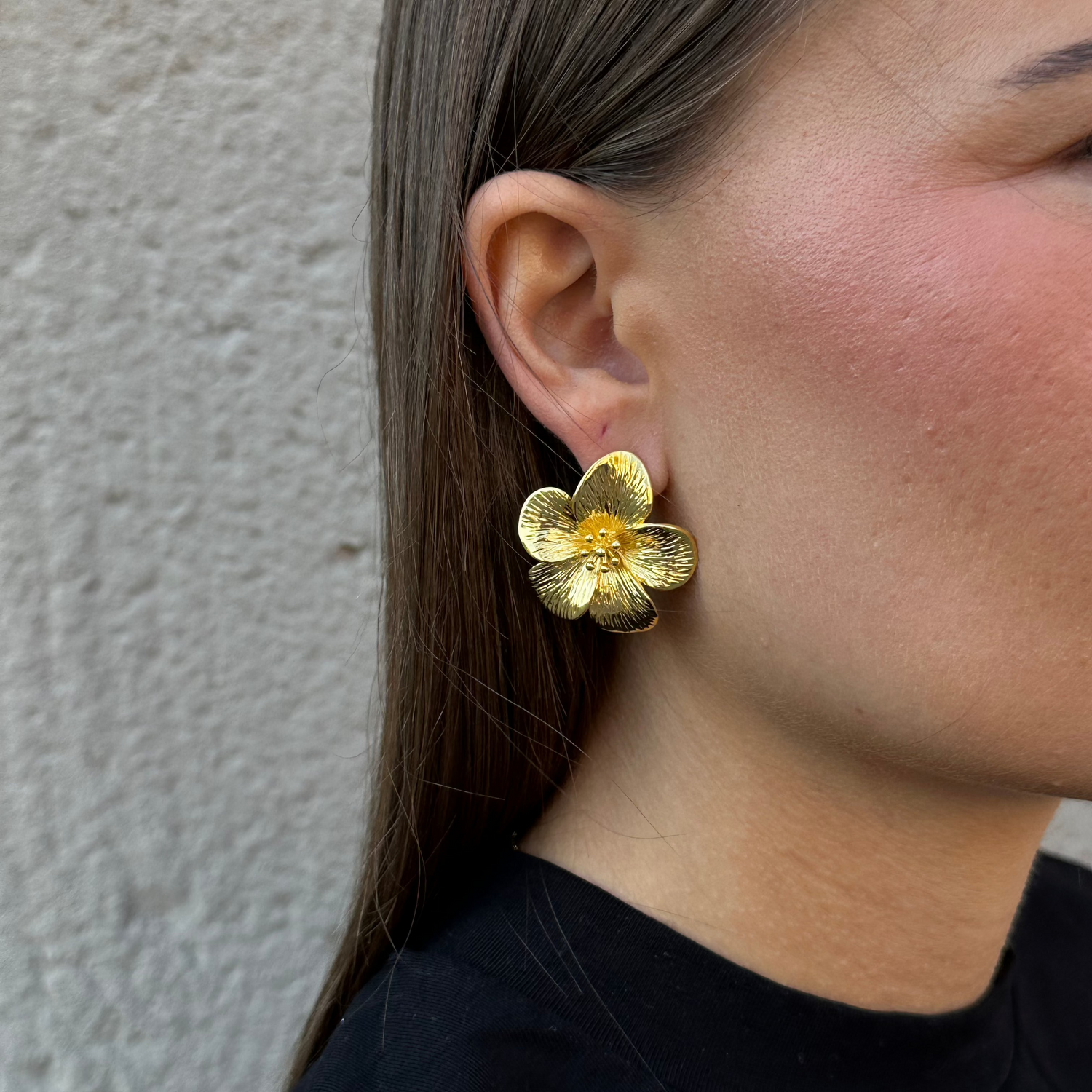 Introducing our LARGE FLOWERS EARRINGS – a tribute to the timeless beauty of nature. These earrings feature a crafted floral design that captures the delicate elegance of blooming flowers. A perfect statement yet feminine jewellery piece for everyday wear or special occasions. Whether you're enhancing your casual outfit or adding elegance to your evening attire, our earrings are the ideal choice. These earrings are made of 18k gold plated brass and they have a size of 30 mm.
