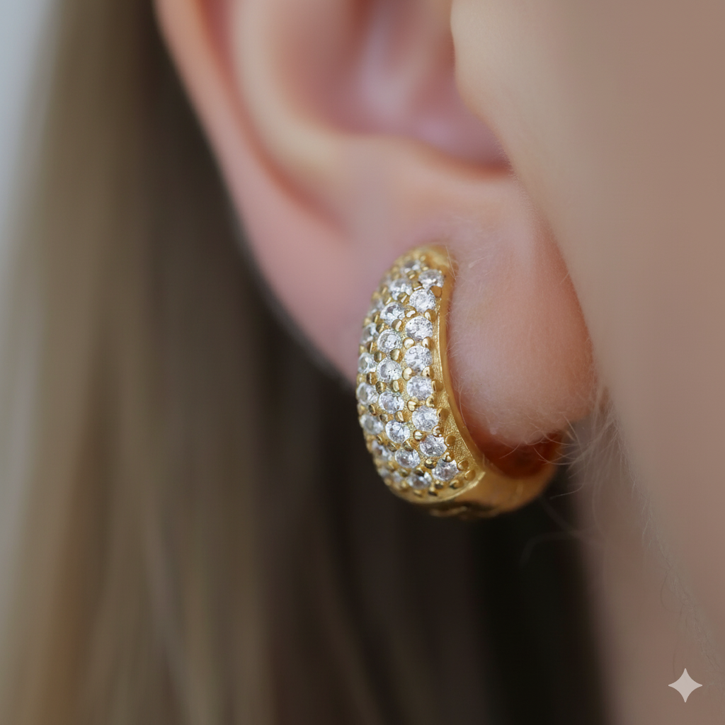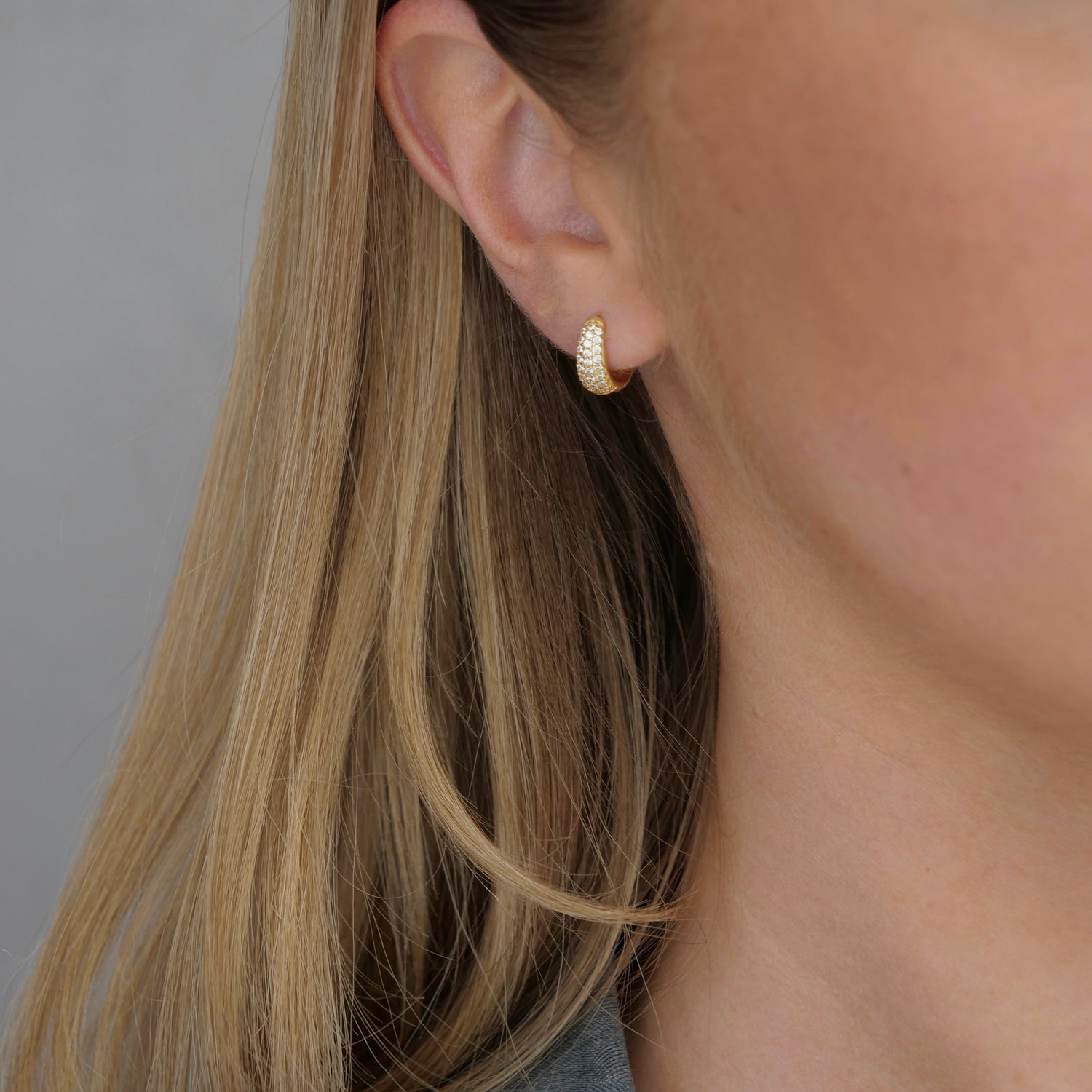 MINI PAVÉ EARRINGS - small sparkling hoops adorned with clear pavé-set zirconia stones. Perfectly crafted to effortlessly transition from day to night, whether you are adding a subtle shine to your everyday outfit or elevating your style for a glamorous event. Lightweight and designed to sit gracefully around the earlobe, these earrings offer both comfort and timeless sophistication. A must-have classic and an exquisite gift that will be cherished for years to come. Delivered in our signature BYBORN jewelry box.