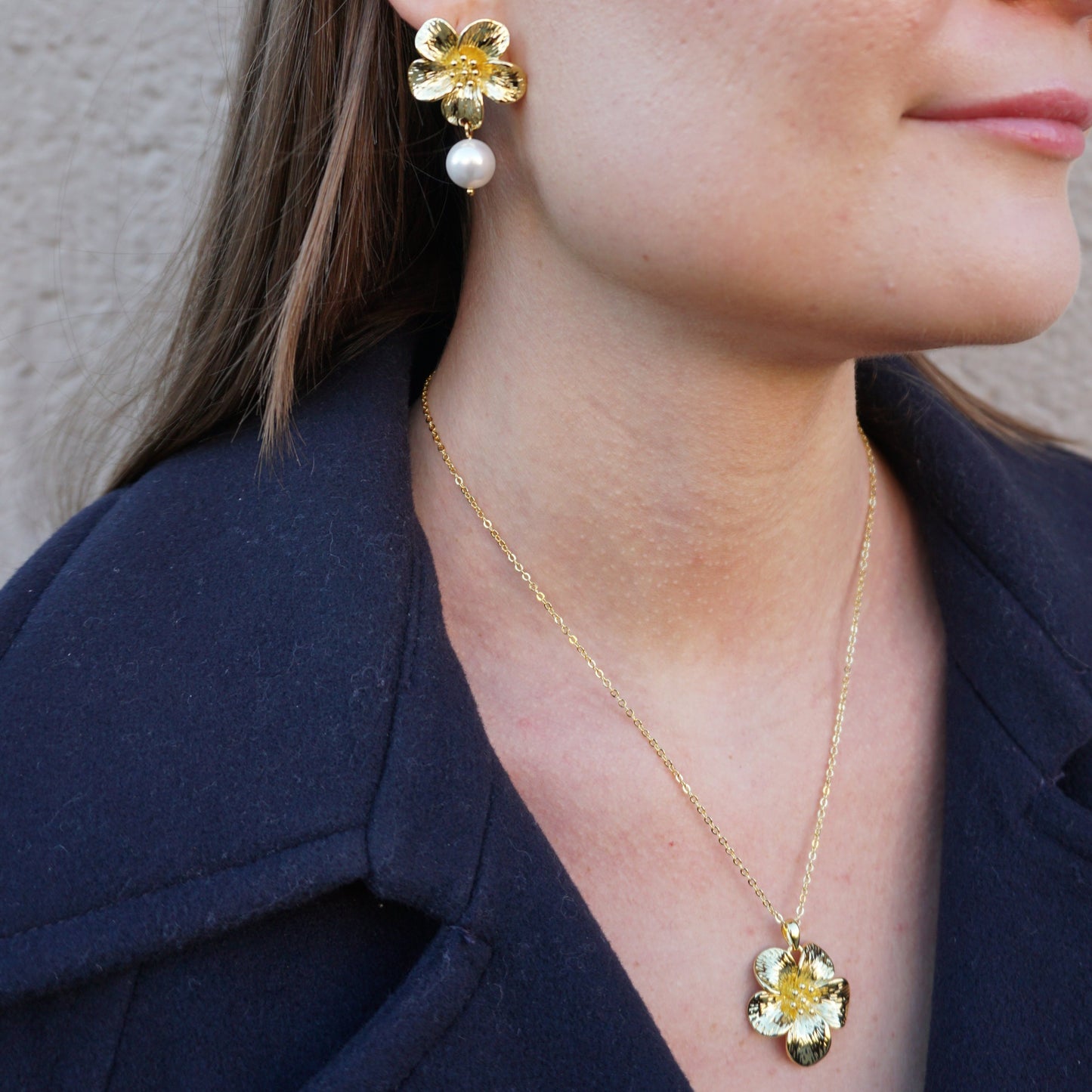Introducing our lovely set including the FLOWER NECKLACE and FLOWER PEARL EARRINGS – This necklace features a crafted floral design that captures the delicate elegance of a blooming flower. The earrings feature an added shell pearl for the classic touch. A perfect statement yet feminine set for everyday wear or special occasions. Whether you're enhancing your casual outfit or adding elegance to your evening attire, this set is an ideal choice.