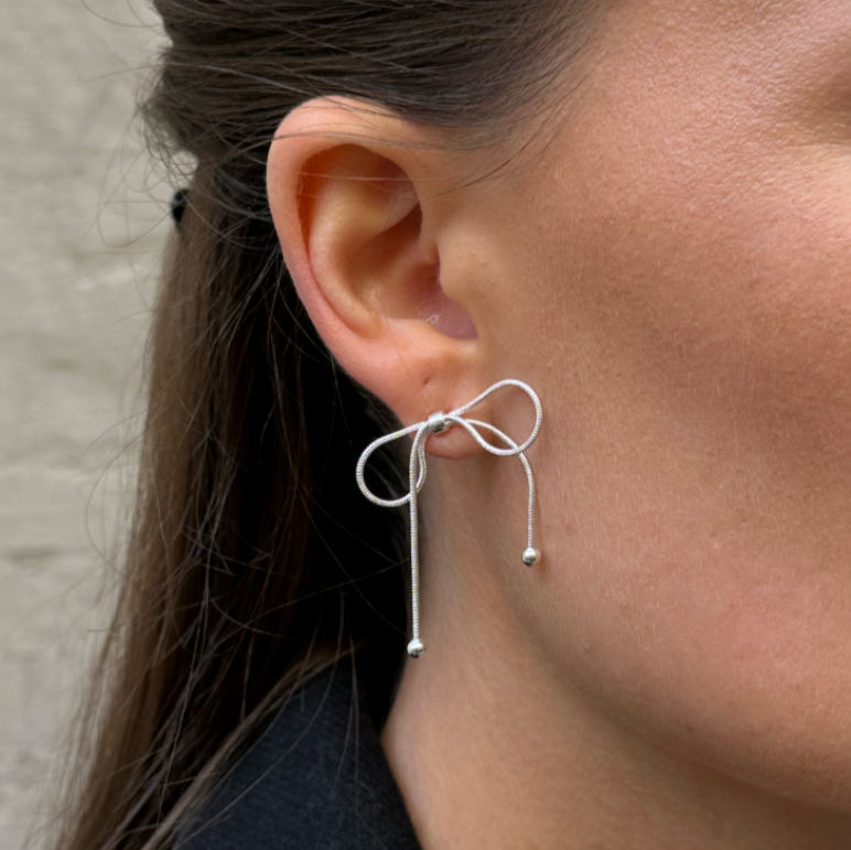 The earrings consist of a thin snake-chain, witch gives each individual bow its unique shape. Designed with push-back locking function and extra light weight.